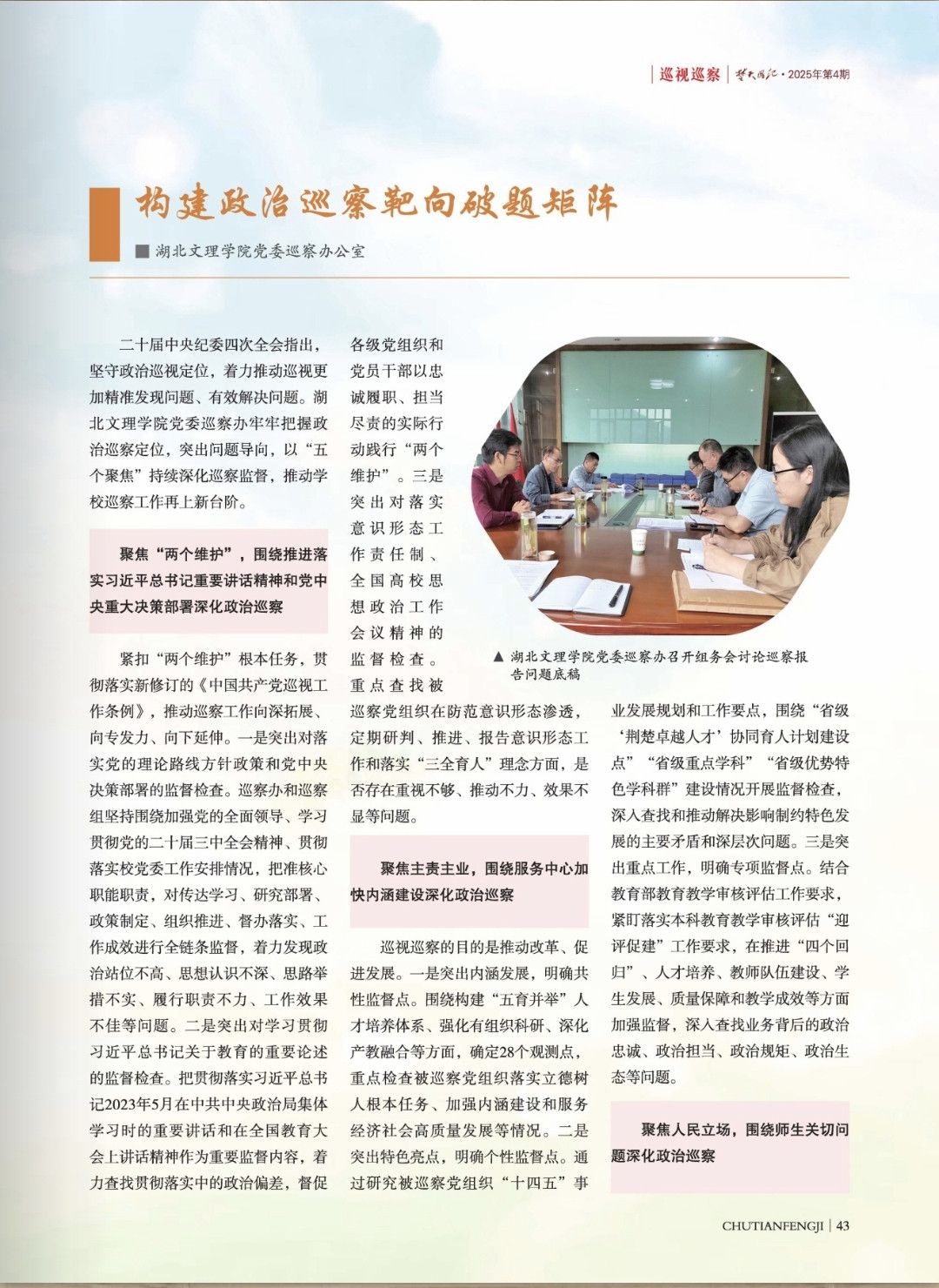 (纪委·监察专员办公室 通讯员 胡旭)近日,中共湖北省纪律检查委员会、湖北省监察委员会主办的刊物《楚天风纪》(2025年第4期),刊发了学校校内巡察工作经验文章《构建政治巡察靶向破题矩阵》。